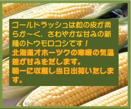 北海道オホーツク産 トウモロコシ ゴールドラッシュは、粒の皮が柔らかくさわやかな甘みのトウモロコシです。